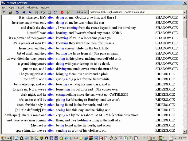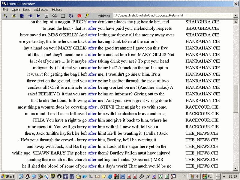 Among the many options for saving returns is the current one which will generate a HTML file from selected rows of returns on either the Quick search or the Advanced search level. The result in both cases is a ‘keyword in context’-type table with the keyword highlighted and vertically aligned in the centre of the screen. You can copy the contents of this file by just selecting text (drag the mouse across the screen with the left button depressed) and then choosing Copy from the picklist which is activated by the right mouse button. This text can be retrieved into another program if you wish, e.g. into your own word processor.