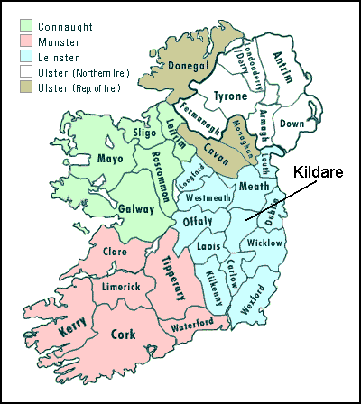 The county of Kildare, west/south-west of Dublin, is the probable source of the main document of Irish English in the early period. It gives the name to a collection called the Kildare Poems, some 16 items in the manuscript MS Harley 913, housed in the British Museum.