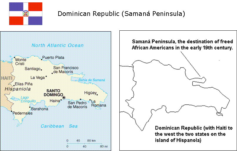By the beginning of the nineteenth century there were movements afoot to free slaves and to offer them the opportunity of repatriation in West Africa. One of these led to the foundation of Liberia which was proclaimed a republic in 1847. Another location for repatriated African Americans was Freetown in Sierra Leone. Again in the early nineteenth century, some African Americans settled on the Samaná peninsula in the Dominican Republic as just mentioned. The African Americans in Nova Scotia in eastern Canada stem from a few thousand who left the United States between 1783 and 1785 as a result of the American Revolution. The locations of these African American diaspora communities are indicated on the following map.