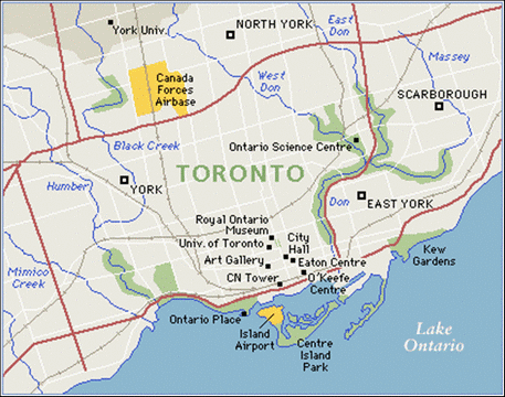 Four of the major cities of Canada: Toronto (5.6), Montreal (3.8), Vancouver (2.3), Ottawa (1.2). The figures in brackets refer to the population of their respective metropolitan areas in millions.