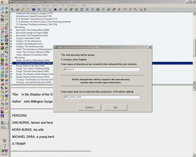 Now press Ctrl-F11 and the window as shown in the following screen shot appears. Here you specify a directory into which the files from the current corpus are to be copied. You also give the new data set a name and then you click on the Conclude button. You may have to confirm overwriting files if they already exist. When the files have been extracted from the current corpus and the new data set has been created you are asked if you wish to load this to view it.