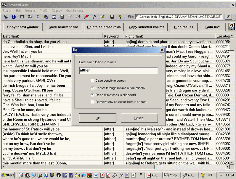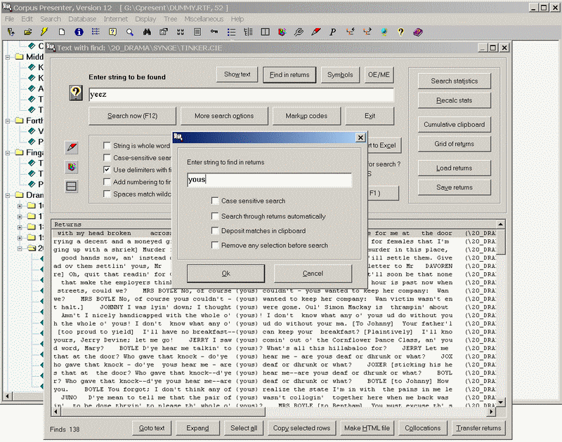 Sometimes the number of returns can be very large, say several hundred when combing through a large numbers of texts. It such situations, it makes sense to search through the returns themselves, particularly if you have used an input list for a search and wish to see what finds were made for a specific member of this list. The option Find in returns on the Quick search level or Get string in returns on the Advanced search level will allow you to comb through the returns for some string you specify. You can have Corpus Presenter stop at each find, or carry out the search automatically. Furthermore, you can have the finds deposited in the Windows clipboard and then paste them into some other software, such as the internal jotter or your own word processor.