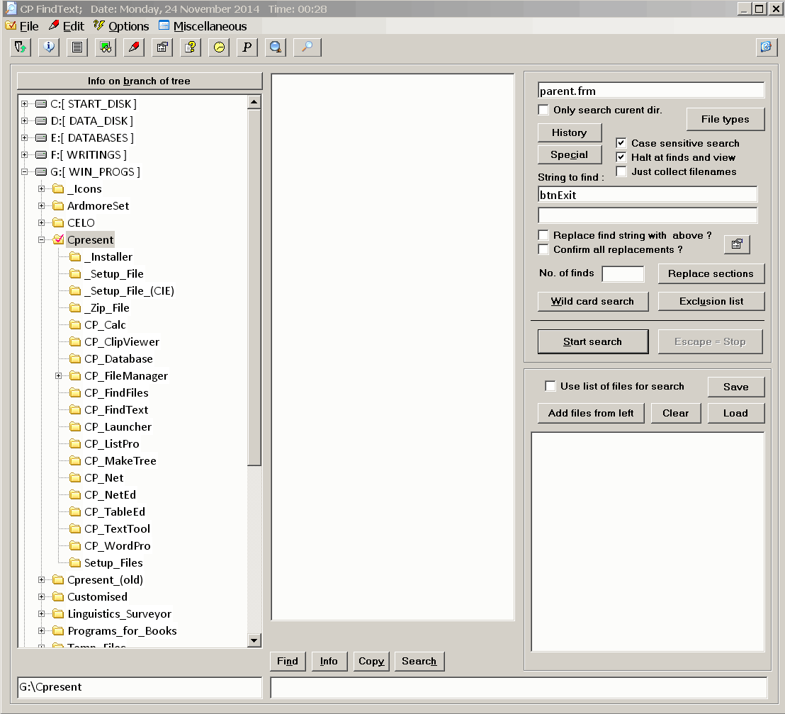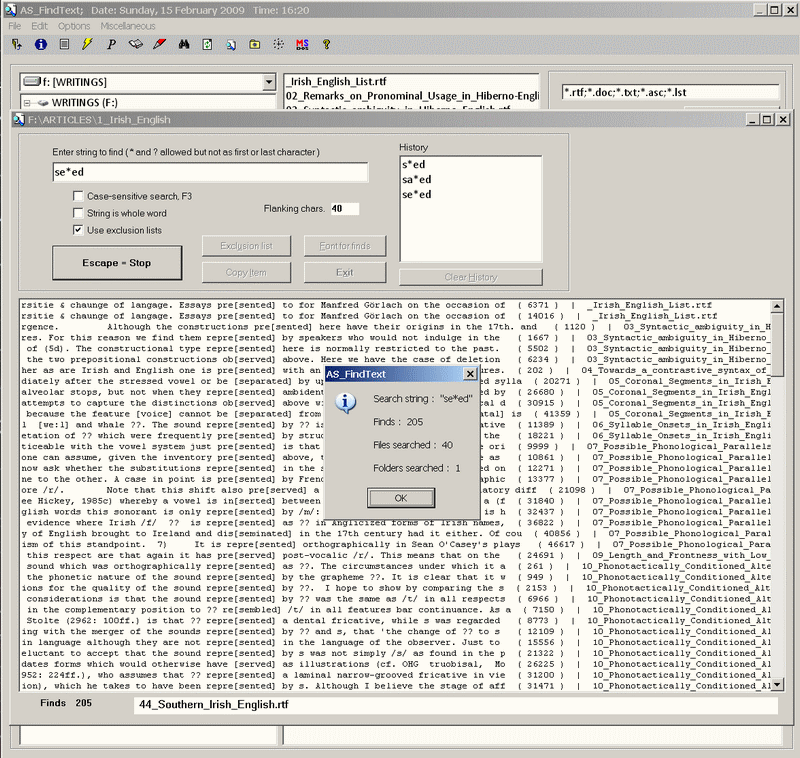 With Corpus Presenter Find Text you can search for strings in texts using wildcards. The results of searches are displayed in a list in the centre of the returns window. By clicking on a return you can view the file in question with the string from the particular return highlighted.