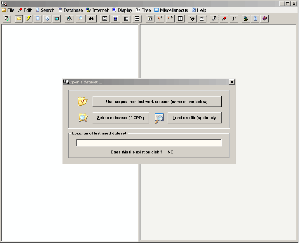 If you decide to load a data set file then you can (1) simply continue processing the corpus you were using last time (note that the program checks to confirm that the necessary data set file is on disk), (2) select a data set (a .CPD file) from a directory listing, (3) load the supplied A Corpus of Irish English or (4) load the supplied test corpus.