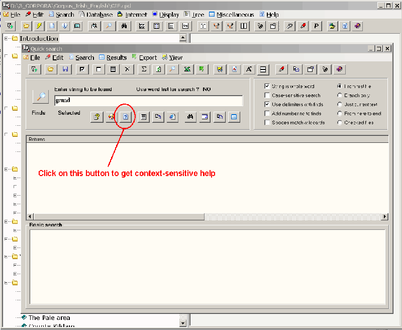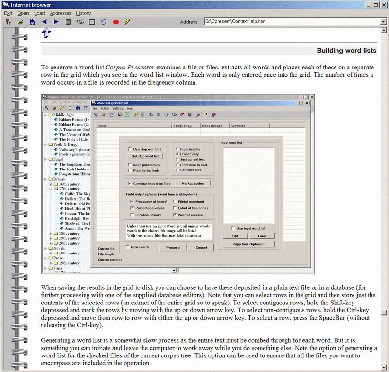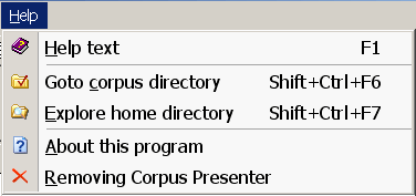 The following screen shots are intended to give an impression of the comprehensive help system which is offered to users by Corpus Presenter. There is a special menu on the right-hand corner of the top line of the screen. This will show you the various options. The help text can be started and kept loaded if you like (select Load and keep help).