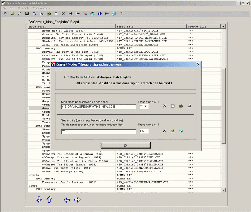 N.B.: In a tree only a terminal node, i.e. a node at the end of a branch which does not lead any further, has a file name associated with it. All other nodes just open up the branch of the tree further. In non-terminal nodes you enter DUMMY.RTF in the first file column. This is a placeholder and not an actual file. Corpus Presenter ignores this and just opens the branch at this point in a tree.