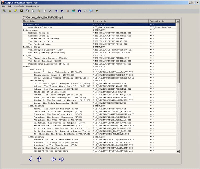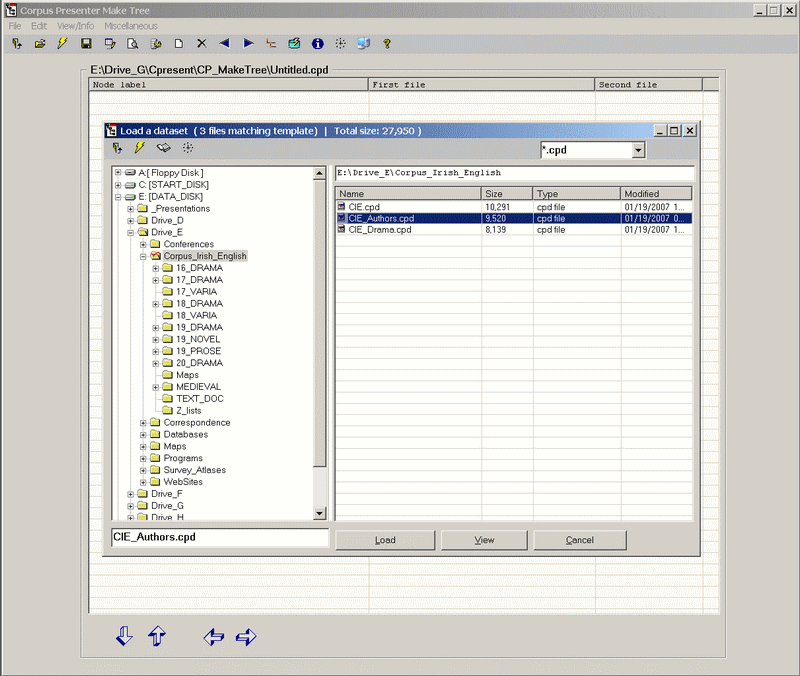 The first step is to load a .CPD file from your disk (unless you wish to start on from scratch). Three such files are supplied with A Corpus of Irish English which will display (i) the entire corpus, (ii) only dramas or (iii) the files sorted by author, depending on which data set you select. Any of these files can be loaded into Corpus Presenter Make Tree from the level which is shown on the following screen.