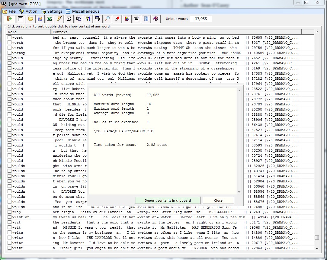 2.10 Word count for current file This option will do a word count for the currently highlighted text in the tree / list on the left and display the results in a text window.