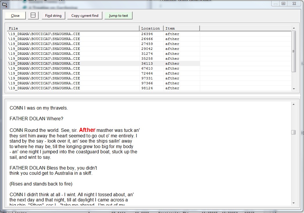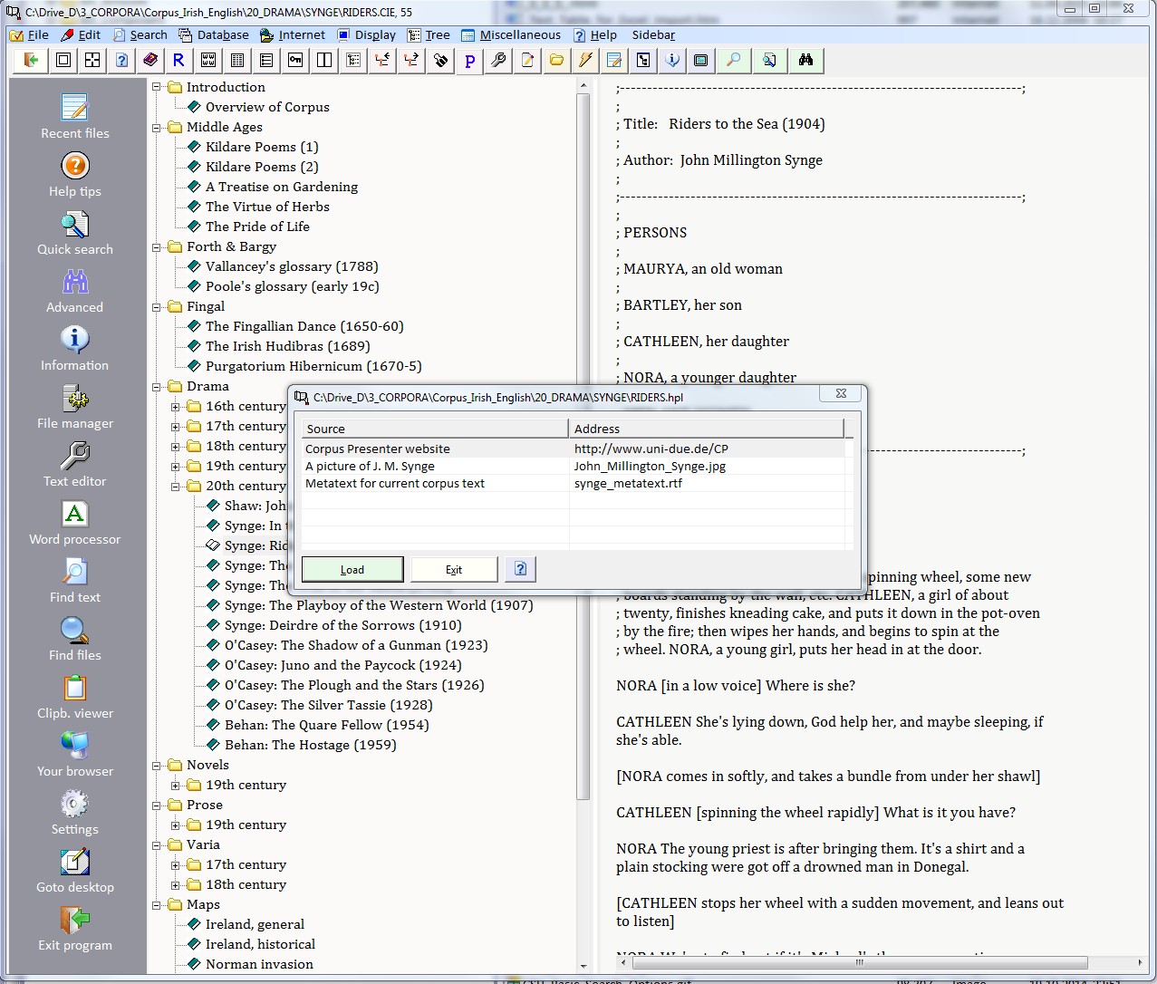 A hyperlink file is structured as follows: two lines are needed for each item, the first line is the description and the second the actual reference, like the following example which matches the file RIDERS.CIE (Riders to the Sea by John Millington Synge in the branch \Drama\20th century in the supplied A Corpus of Irish English).