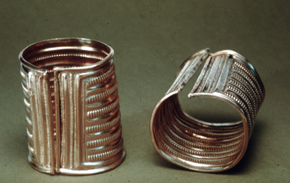 Gold dress fastener found at Clones, Co. Monaghan and set of armlets