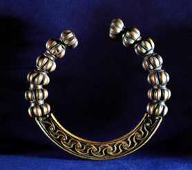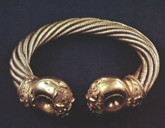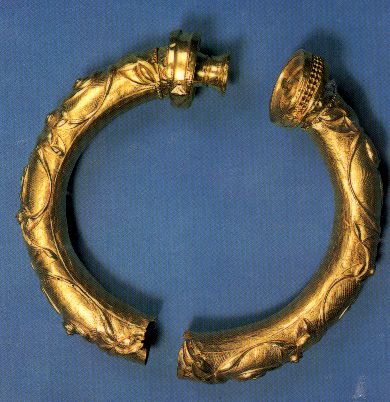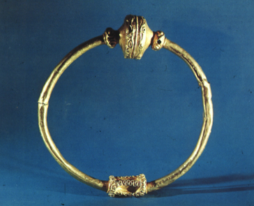 From the late Bronze Age (after the Stone Age and before the Iron Age, probably early in the first millennium BC) there are some artefacts which have been found. Two examples are shown here, both items of gold jewellery worn around the neck.