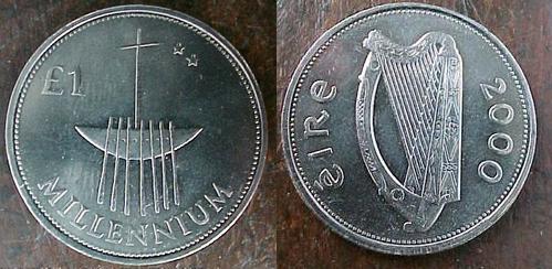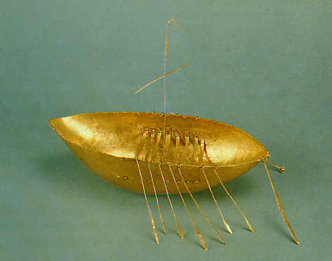Left: The model ship of beaten gold from the Broighter Hoard, right: commemorative coin