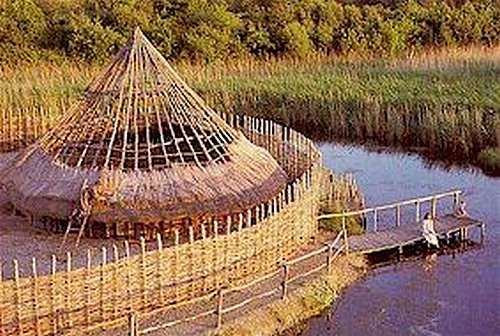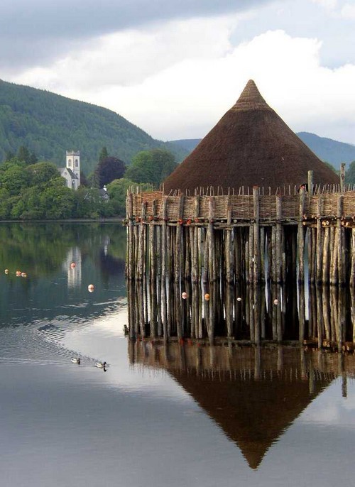 Reconstructed crannogs (late Stone Age hut dwellings built out on a lake) in Tay, Scotland and in Ferrycarrig, Co. Wexford (Irish National Heritage Park)