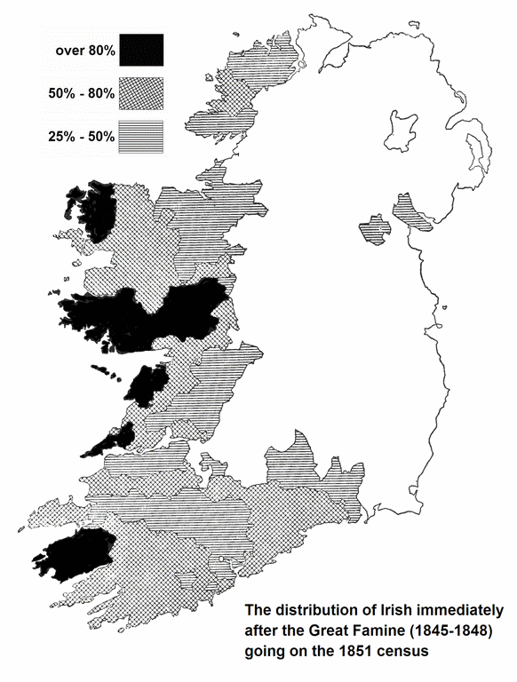 The exclusion of Irish from public life resulted from the Penal Laws, a collective term for anti-Catholic, i.e. anti-Irish, legislation which greatly diminished the standing of the language and its speakers in Irish society. With further developments of the 17th century, notably the campaigns and expulsions by Oliver Cromwell in the late 1640s and early 1650s, language shift from Irish to English began on a wide scale. This was a process which was never to be reversed. Other major demographic events, especially the Great Famine of the 1840s and the subsequent mass emigration, led to a serious drop in the numbers of Irish speakers so that by the late 19th century the Irish-speaking districts were fragmented into three areas, Cork-Kerry, Galway-Mayo and Donegal with a very small enclave in Waterford.