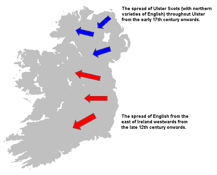 The development of Irish has been closely connected to that of English ever since the latter language was introduced to Ireland in the late 12th century. In general the principle holds, that the expansion of English has been to the detriment of Irish. This is because English expanded in previous centuries chiefly by original Irish speakers switching to English. The spread of English has been largely from east to west, from the better to the poorer parts of the country.