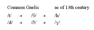 The term ‘Common Gaelic’ (Jackson 1952) is used to refer to a stage of Q-Celtic in which Scottish Gaelic had not separated from Irish through the development of features of its own. According to Jackson this stage lasted until approximatly 1200. Certainly the phonology of Scottish Gaelic (and Manx) shows the same velarisation and glottalisation which is attested in Irish after the loss of interdental fricatives as the lenited forms of T and D.