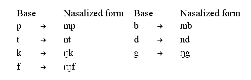 There may be cases where voice becomes phonetically irrelevant and one is left with only three nasal clusters /mb, nd, ŋg/. In such instances aspiration may be retained as a phonetic clue as to which clusters derive from a input voiceless stop which was nasalised.