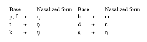 It is difficult to determine whether nasalisation in Scottish Gaelic was always of this kind. Certain fixed forms would suggest that the Irish pattern of nasalisation once obtained and that the Scottish one was a later independent development, cf. /v/ bh as the nasalised form of /f/ in locative adverbs like abhán ‘down’ abhos ‘over here’.