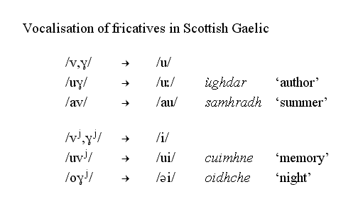 Vocalisation of fricatives Internal lenition has been carried to its conclusion and voiced fricatives have merged with the vowel which precedes them to form new diphthongs. The type of diphthong which results depends on whether the former fricative was palatal or non-palatal.