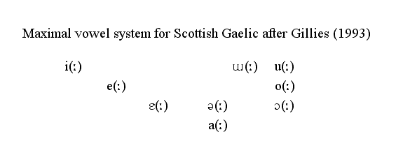 Vowel system of Scottish Gaelic There are more vowel contrasts in Scottish Gaelic than in Irish for two reasons. The first is that there is a distinction in the mid area between closed and open vowels, i.e. /e:/ # /ɛ:/ and /o:/ # /ɔ/. This would apply to long vowels but it is not certain whether the short vowels /e, ɛ/ and /o, ɔ/ are not simply contextually determined variants dependent on the quality of flanking consonants.