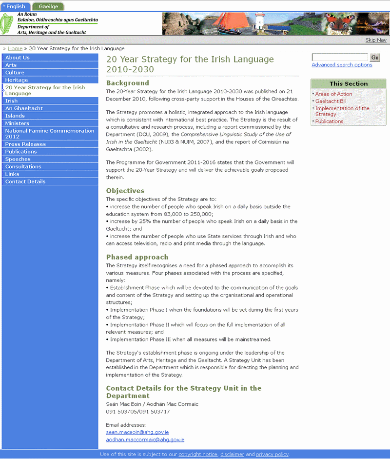 This is a strategy announced by the previous Fiann Fáil government in 2012 and is intended to coordinate efforts for the support and maintenance of the Irish language and its attending infrastructure over the next two decades. There is a government website laying out the objectives of the strategy accessible at: 20 Year Strategy for the Irish Language 2010-2030.