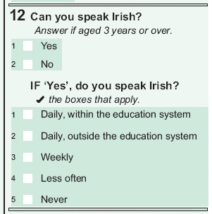 The above statistics imply that between 1926 and 2006 the number of Irish speakers in Ireland more than trebled. This is plainly absurd. Consider that the census returns were formerly based on self-assessment: individuals were asked if they could speak “Irish only”, “Irish and English”, “Read but cannot speak Irish” and the responses formed the basis of the statistics produced later. In the 2006 census the language data were collected by asking a single question: ‘Can you speak Irish’; below is the relevant part of the census questionnaire.