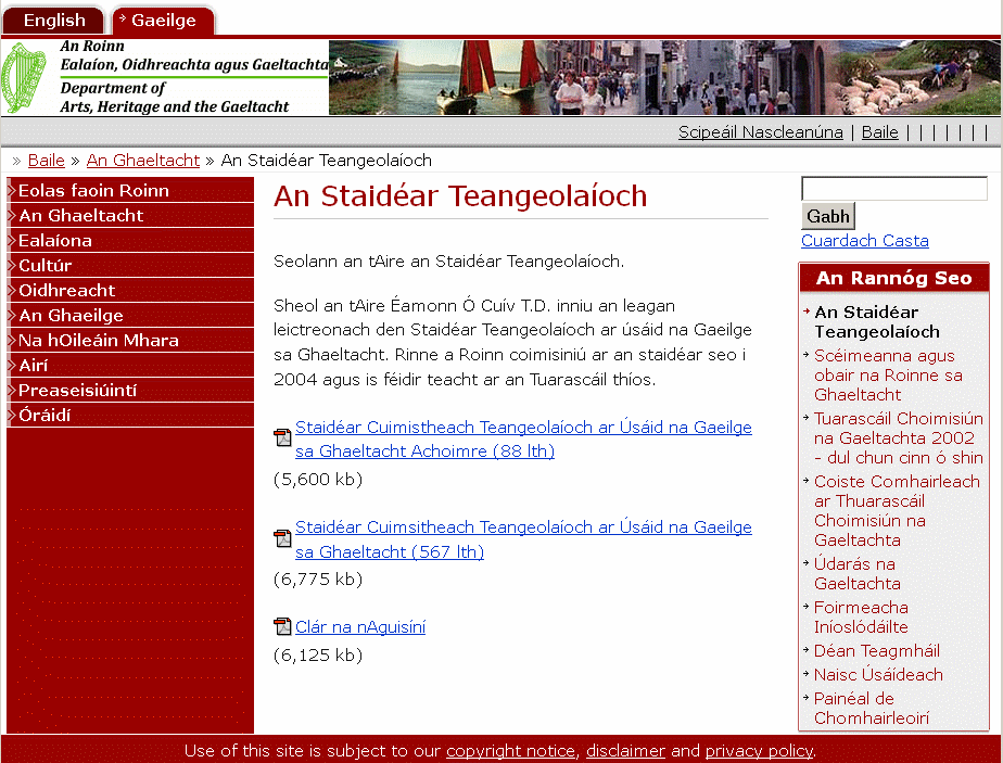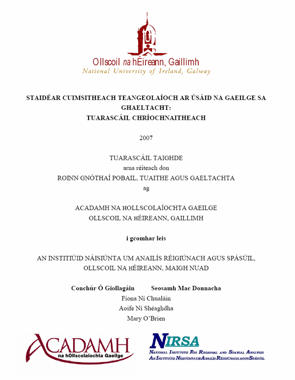 In 2004 the Roinn Gnóthaí Pobail, Tuaithe agus Gaeltachta ‘Department of Community Rural and Gaeltacht Affairs’ (as it was then called, now [2011] it is the An Roinn Ealaíon, Oidhreachta agus Gaeltachta, ‘Department of Arts, Heritage and the Gaeltacht’) commissioned a comprehensive study of the use of Irish in the Irish-speaking regions (Gaeltacht areas). This linguistic work was carried out by a group of scholars, chiefly Conchúr Ó Giollagáin and Seosamh Mac Donnacha, from the National Univerity of Ireland, Galway in cooperation with the National Univerity of Ireland, Maynooth. The results of this research were published in autumn 2007 as a comphrensive document, Staidéar Chuimsitheach Theangeolaíoch ar Úsáid na Gaeilge sa Ghaeltacht ‘Comprehensive linguistic study of the use of Irish in the Irish-speaking regions’ (552 pages).