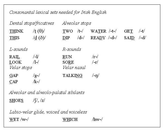 In Irish English the area of coronal obstruents, stops and fricatives between the dental and palatal points of articulation, is particularly crucial. For that reason a number of items in the sample sentences attempt to record specific instances of these segments.