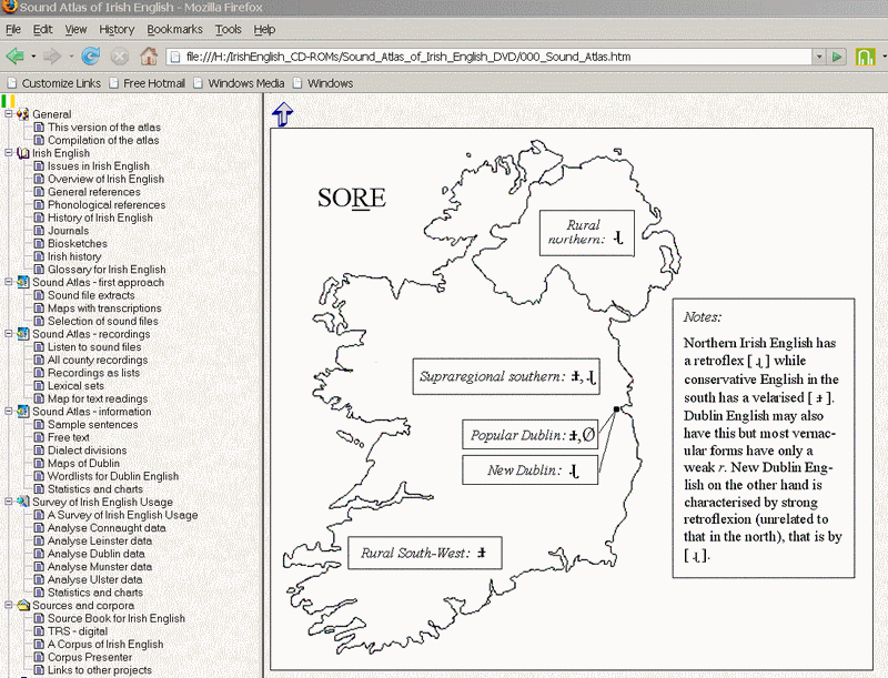This section allows you to access the sound files based on recordings of speakers from different parts of Ireland which were made by Raymond Hickey during several years of field work. The data made available here is only a very small section of the total amount contained in A Sound Atlas of Irish English (Berlin: Mouton de Gruyter, 2004). In all there are over 1,500 recordings stemming from nearly 1,200 speakers in the sound atlas. There is also sophisticated processing software (written by the present author) which will allow you to extract information from the atlas using parameters which you specify yourself, for instance you could look at all female speakers from rural areas above 50 or all males under 20 from urban centres. You can also consult the realisations of lexical sets with speakers from different parts of the country. There are stretches of free text as well, again read by speakers from various parts of the country.
