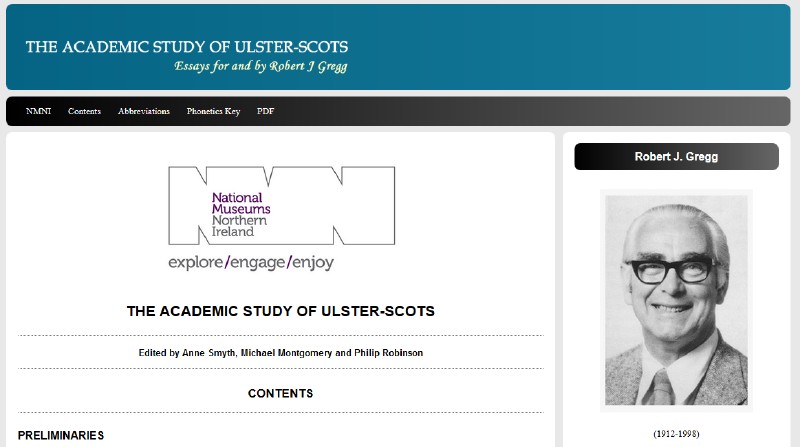 The Academic Study of Ulster-Scots: Essays for and by Robert J Gregg. (2006, edited by Anne Smyth, Michael Montgomery and Philip Robinson, published by the Ulster Folk and Transport Museum, Cultra, Co. Down, Northern Ireland. The above image is a screenshot of the electronic version of this resource to be found at http://nmni.com/uftm/Collections/Library/Academic-Study-of-Ulster-Scots