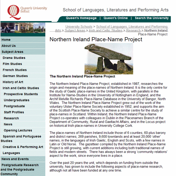 Website of the Northern Ireland Place-Name Project at Queen’s University, Belfast which has already published several volumes.