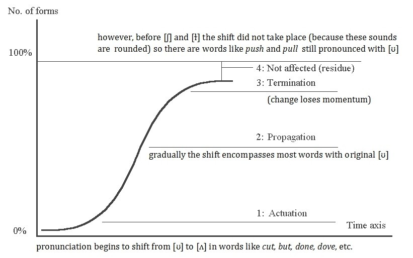 A good linguistic example to illustrate an s-curve with is the case of shift from /ʊ/ to /ʌ/ in early modern English. This change would appear to have started in the mid 17th century and was active for at least 150 years after this in the south of England. Not all instances of /ʊ/ were shifted to /ʌ/. The small set of forms which did not undergo the shift from /ʊ/ to /ʌ/ are those which were phonetically resistant to the change, i.e. which were both preceded and followed by sound with inherent rounding. The elements which have such rounding are labial plosives, palato-alveolar fricatives and a velarised syllable-final [ɫ], hence pull, bull, push, bush, should still have /ʊ/ in standard English. These words occupy the gap between the top of the s-curve and the 100% mark on the vertical axis.