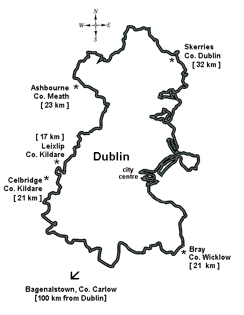 The edge of the metropolis would seem to be defined by the distance one can travel in and out of the city easily in one day. The towns listed above are all under 32 km distance from the centre of Dublin.