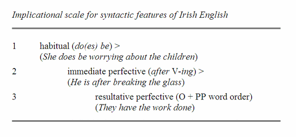 An implicational scale consists of a number of features from a variety or subvariety which stand in a given relationship to each other. The implication of the label derives from the fact that if feature X is present in someone’s speech then feature Y will be as well. There may be several features involved in this kind of implicational relationship. Consider for example the occurrence of non-standard grammatical features of Irish English. These can be arranged as an implicational scale as shown below. The scale implies that if a speaker or speakers have the most vernacular feature (on the top left) then they will have the middle feature and the right-most feature, i.e. the features in the table are arranged in an ascending order of standardness in Irish English..
