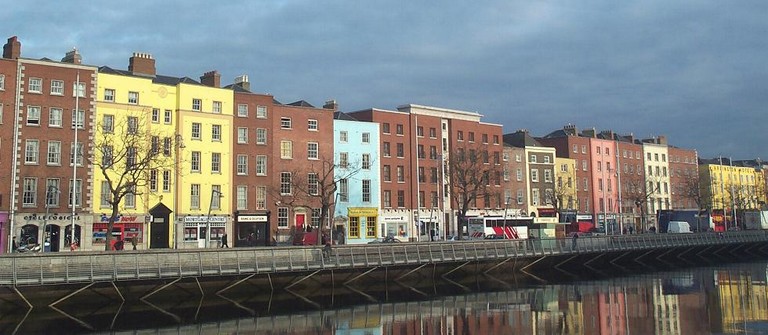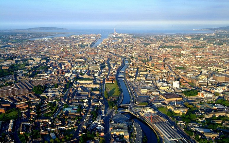 View down the Liffey looking eastwards through the centre of Dublin towards Dublin Bay. In this picture the north side is on the left of the river and the south side is on the right.