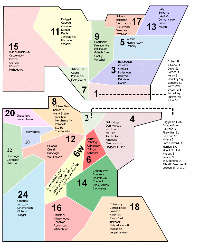 Dublin is divided into two basic halves, the North Side and the South Side. The dividing line is the Liffey in its horizontal course through the centre of the city before it enters the middle of Dublin Bay. Many of the speakers recorded by the author over the past two decades identified themselves as from the north or the south. Beyond that, speakers identified themselves according to the part of Dublin (district of the city or suburb in the greater Dublin area) they came from.