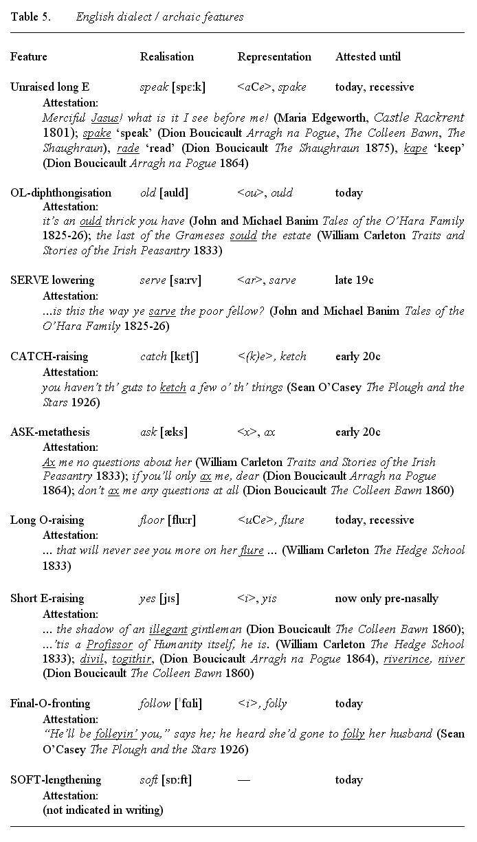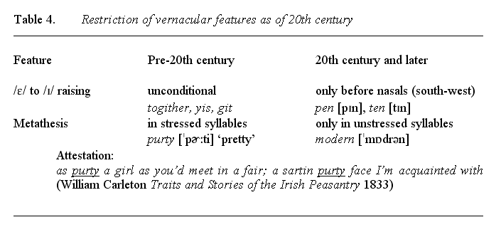 1) | Middle English /ɛ:/ was not raised to /i:/. The pronunciation [ɛ:] can still be heard in Dublin in words like tea, leave, please. Of these, the first is still found as a caricature of a by-gone Irish pronunciation of English. Hogan (1927: 65) noted in his day that the non-raised vowel was rapidly receding. Today it is somewhat artificial; the pronunciation is also found in the north of the country, where equally it is a retention of an earlier value. |