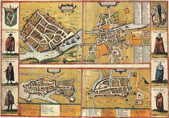 Historical map of four Irish towns (from top left in clockwise direction: Galway, Dublin, Cork and Limerick)