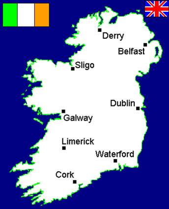 Dublin is by far the largest city in Ireland. Among the remaining cities Cork (in the Republic of Ireland) as well as Belfast and Derry (both in Northern Ireland) rank next in terms of size with Cork about 120,000, Derry over 100,000 and Belfast (the capital of Northern Ireland) about 400,000. The remaining cities of the Republic of Ireland, which are all under 100,000, are Waterford, Limerick and Galway (in clockwise direction starting from the South-East). Other smaller cities or towns are regional centres, e.g. Kilkenny in the inland South-East, Sligo in the lower North-West