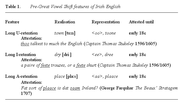 2) | A pronunciation of English /ai/ from Middle English /i:/ as [ei] is found, though it is uncertain whether Sheridan means this or perhaps [əi] which would tally better with what is known from present-day Dublin English. |