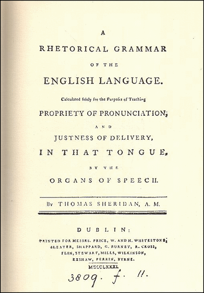 Sheridan, Thomas 1781. A Rhetorical Grammar of the English Language, calculated solely for the purpose of teaching propriety of pronunciation and justness of delivery, in that tongue. Dublin: Price.