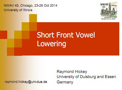 The following is a presentation from the NWAV 43 conference held in University of Illinois, Chicago in October 2014. It contains a description and analysis of Short Front Vowel Lowering in Dublin English and uses a number of recent sound files as illustrations. The presentation is a PDF file, the sound files referred to are also contained on the present website, see “Most recent changes in the tree on the left”.