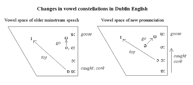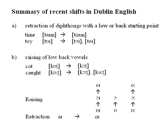Speakers began to move away in their speech from their perception of popular Dublin English, a classic case of dissociation in an urban setting. This dissociation was realised phonetically by a reversal of the unrounding and lowering of vowels typical of Dublin English hitherto. The reversal was systematic in nature, with a raising and rounding of low back vowels and the retraction of the /ai/ diphthong and the raising of the /ɒi/ diphthong, representing the most salient elements of the change.