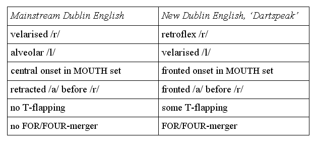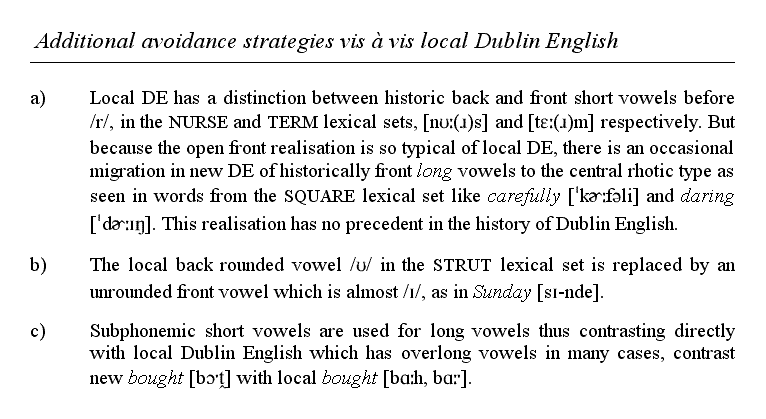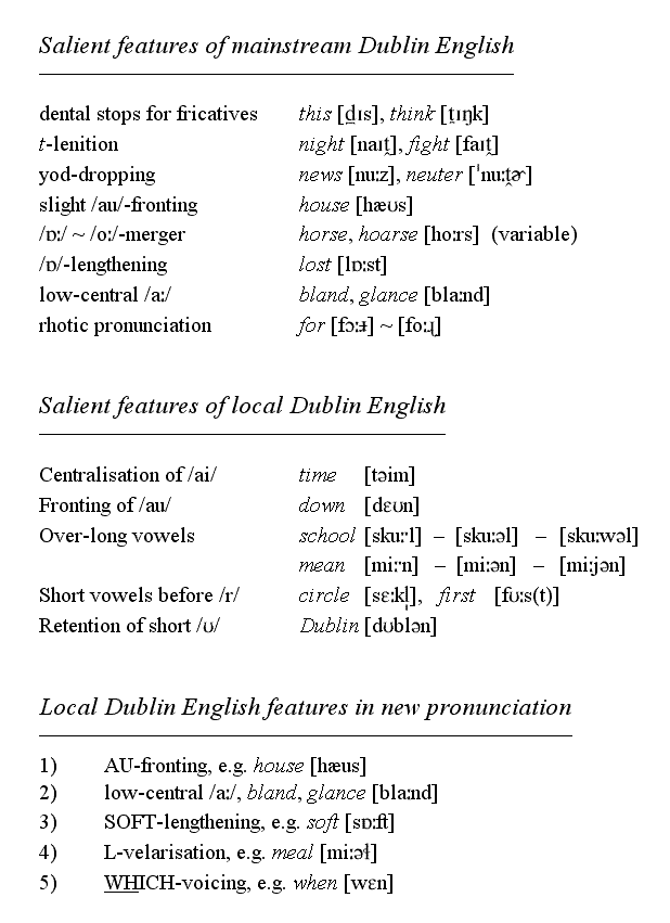 Apart from the vowel shift illustrated above, one can point to other features of the new pronunciation in advanced Dublin English to show how these were, and in the main still are, diametrically opposed to characteristics of strongly local forms of English in the capital.
