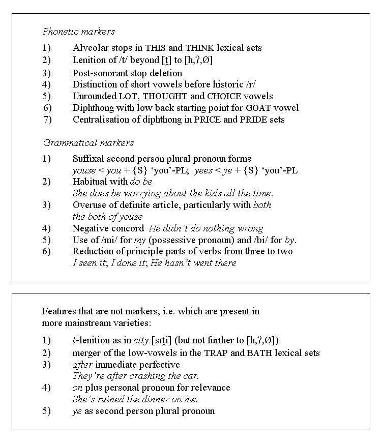 In the following tables, those features which have marker status are listed first while those which can be labelled indicators of Irish English can be found in the second table. Note that the distinction between marker and indicator applies to grammatical features as well (see examples below).