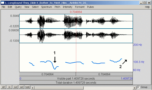 Lastly one should mention that the intonational patterns in Ulster English, especially Ulster Scots, are quite different from those in Dublin. In the following sound file one can hear a typical Ulster Scots speaker uttering a simple sentence. Note the intonational dip on the stressed syllable of ‘bother’ and the rise at the end of the sentence. This final rise is incidentally much older than the high rising terminal which spread through the anglophone world in recent decades and is unrelated to it. Both the dip (arrow 1) and the rise (arrow 2) can be clearly recognised in the spectrogram of the sentence.