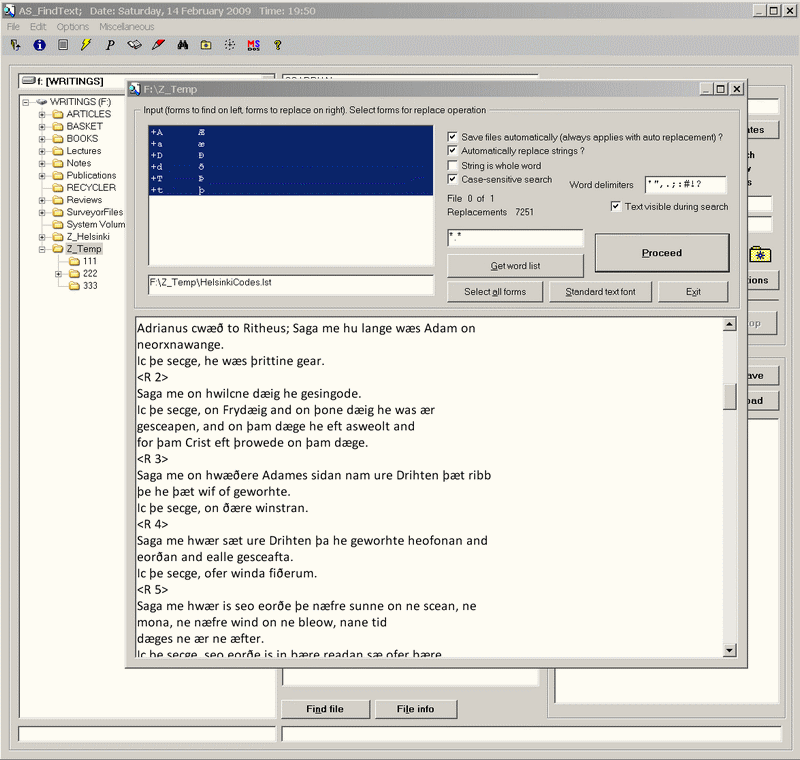 To carry out the replacements, do the following. Unzip the download file Helsinki.zip from the above link to the directory in which you keep the files of the Helsinki Corpus. Start Corpus Presenter Find Text and enter this directory. Choose Helsinki_Codes.lst as the file with input form for the Find / Replace operation. Select all the forms and click on the Proceed button. When the files have been processed, all replacements will have been made, some 202,550 in all. The procedure should take some minutes, that is normal.