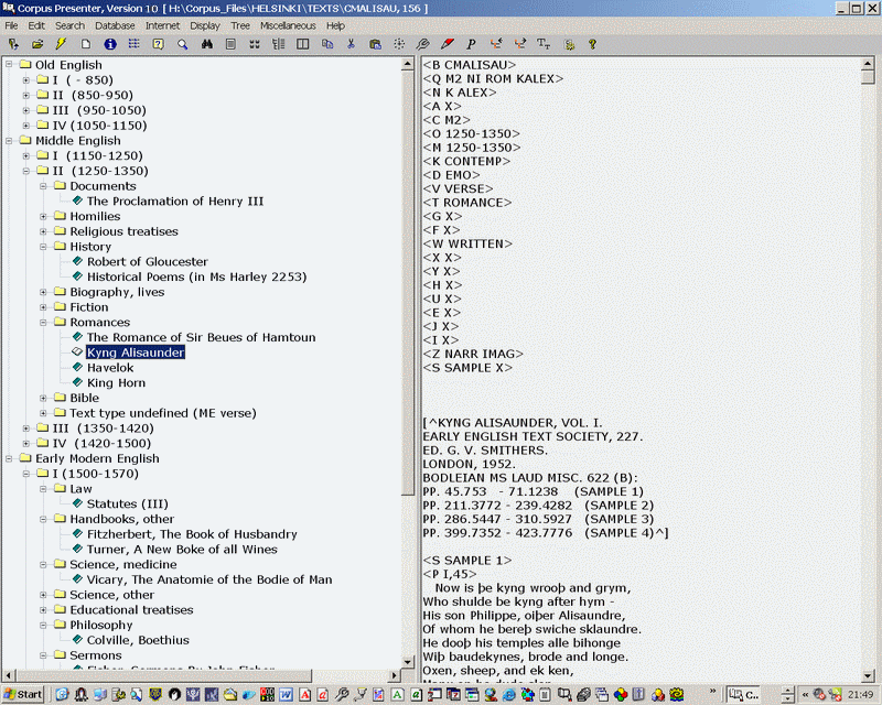 The Helsinki Corpus of English Texts consists of 242 text files which are located in a single directory. I have constructed a data set file – Helsinki_Corpus.cpd – which will display the Helsinki Corpus as a hierarchical tree divided into layers according to period (Old, Middle and Early Modern English) and sub-period and then by genre as can be seen in the following screen shot.